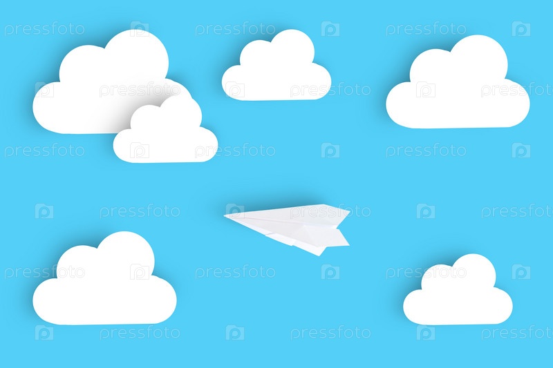 Белые облака, вырезанные из бумаги, с тенью на синем фоне с летающим бумажным самолетиком
