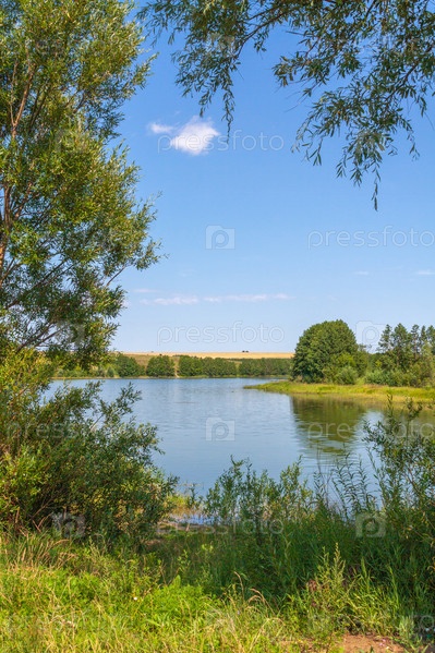 Красивый сельский летний пейзаж с озером или рекой и полем спелой пшеницы, голубым ясным небом и зелеными деревьями