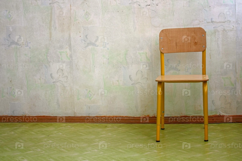 Одинокий детский деревянный стул возле стены с выцветшими, грязными, потертыми обоями в детском учреждении. Интерьер неопрятный социальный центр