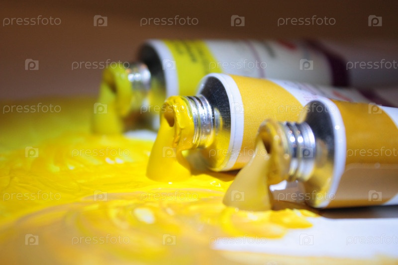 На столе разложены три тюбика желтой акриловой краски разных цветов с отвинченными крышками и текущей краской
