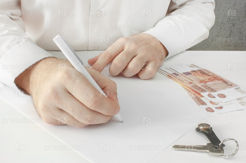 Человек без лица подписывает на бланке дарственную, доверенность, завещание. Рядом лежат ключи от квартиры и купюры российских денег