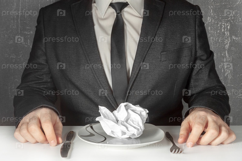 Мужчина без лица в черном костюме и галстуке сидит за столом и готовится съесть скомканный лист бумаги, контракт, контракт, стол из тарелки, используя нож и вилку