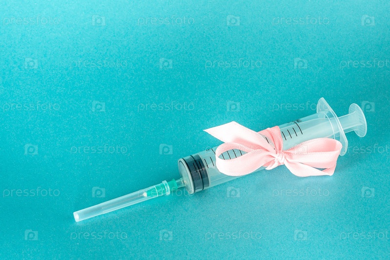 Одноразовый шприц с завязанным розовым бантом крупным планом на синем фоне. Открытка с подарком ко дню медика