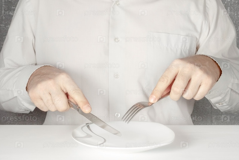 Человек без лица сидит за столом с ножом и вилкой в руках и ест воображаемую еду из пустой тарелки
