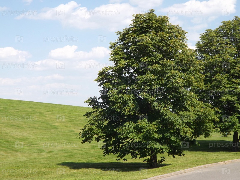 Каштан на склоне холма на фоне пасмурного неба