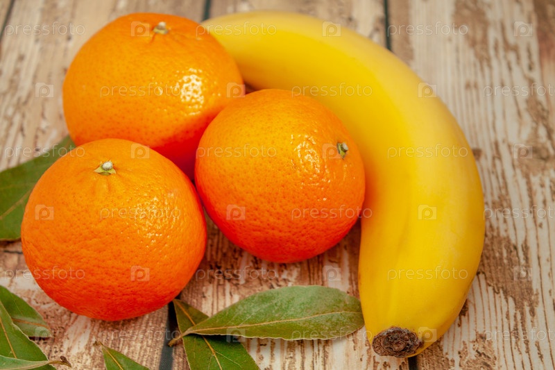 Три спелых мандарина и банан на деревянном фоне рядом с зелеными листьями крупным планом с избирательным фокусом