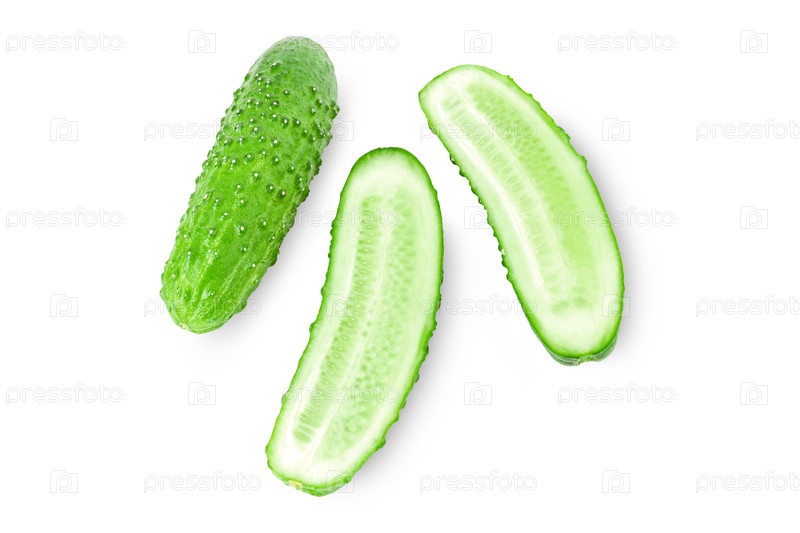 Хрустящий свежий зеленый огурец, разрезанный на две части крупным планом на белом фоне