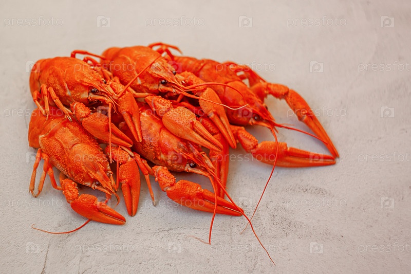 Букет из пяти свежесваренных красных раков с длинными усами и клешнями. Крупным планом на сером текстурированном фоне. Селективный фокус