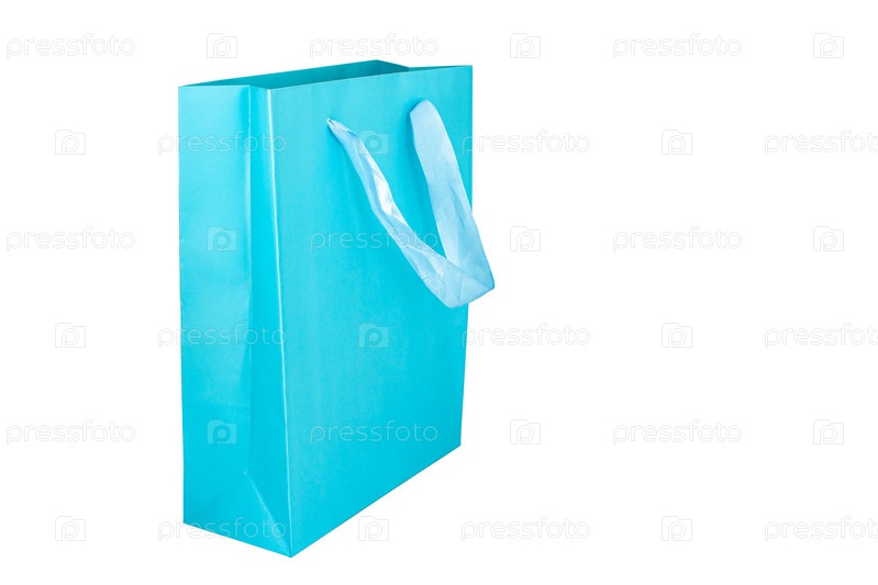 Синий бумажный подарочный пакет крупным планом на белом фоне