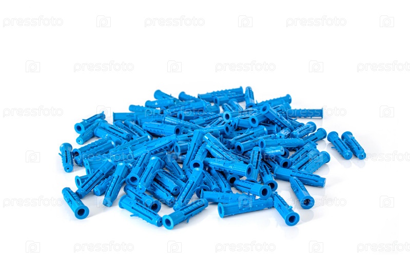 Куча синих пластиковых строительных дюбелей крупным планом на белом фоне