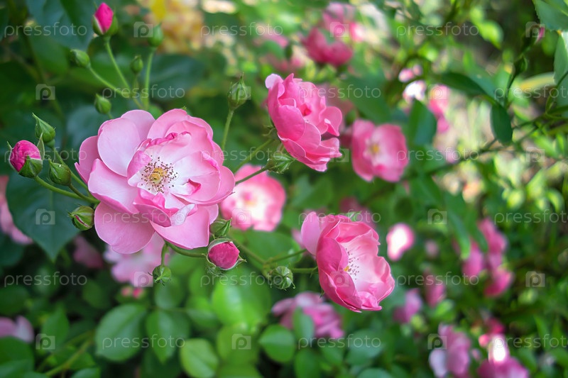 Цветущий куст шиповника в саду крупным планом на размытом фоне