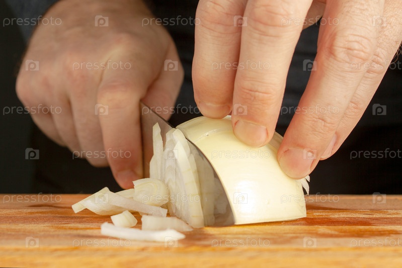 Мужские руки режут поварским ножом луковицу крупным планом