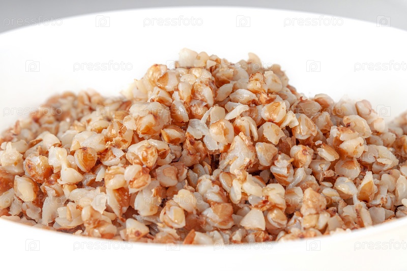 Гречневая каша в белой тарелке крупным планом