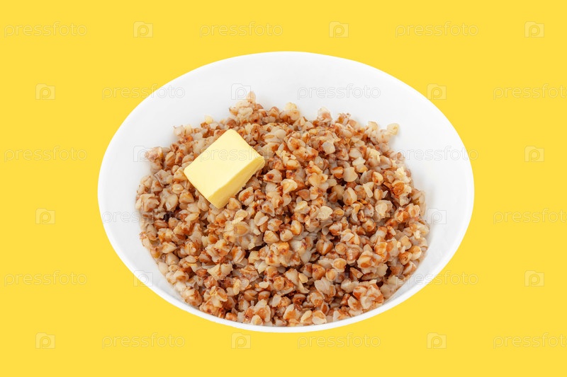 Глубокая белая тарелка с вареной гречкой и кусочком сливочного масла крупным планом