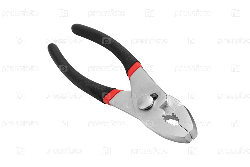 Маленькие стальные плоскогубцы с черными ручками. Крупный план. Отдельный на белом фоне
