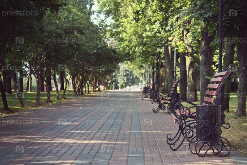 Парковая аллея со скамейками, уходящими вдаль среди зеленых густых деревьев
