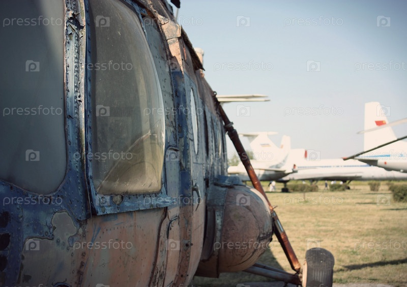Сторона старого ржавого вертолета на фоне освещенного поля с брошенными пассажирскими самолетами