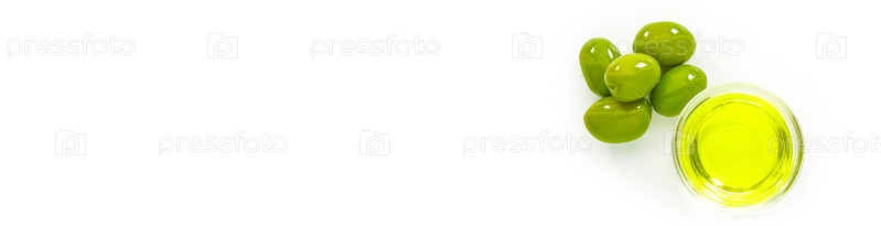 Баннер с большими зелеными оливками и стеклянной миской с оливковым маслом на белом фоне. Вид сверху крупным планом