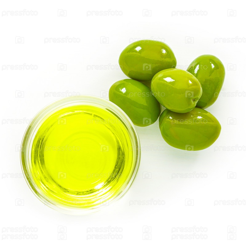 Большие зеленые оливки и стеклянная миска с оливковым маслом на белом фоне. Вид сверху крупным планом