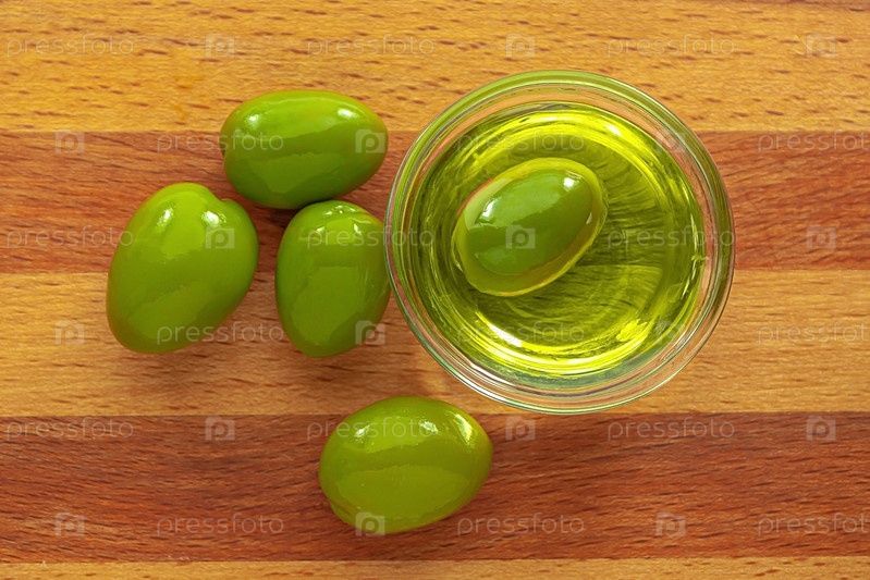 Большие зеленые оливки и стеклянная миска с оливковым маслом на деревянном фоне. Вид сверху крупным планом