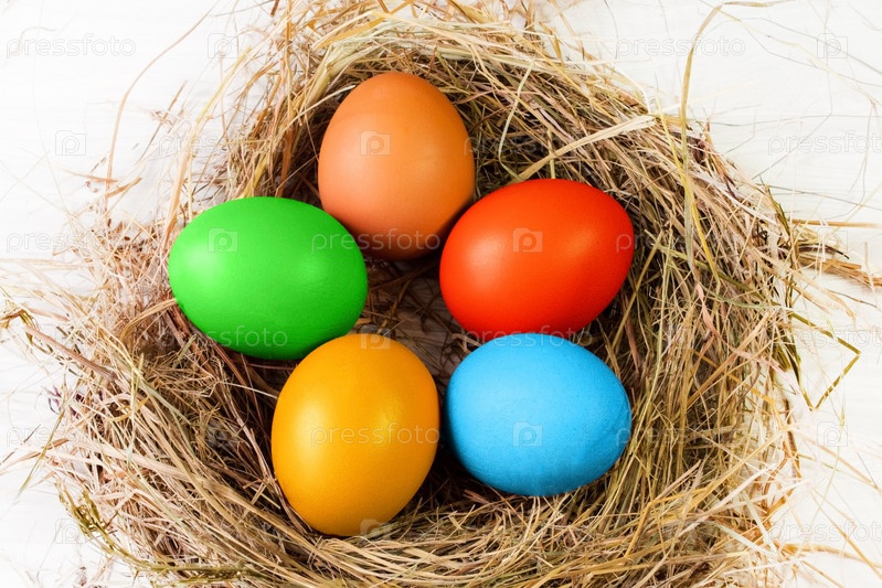 Пять пасхальных яиц, окрашенных разноцветными красками, лежат в форме цветка в гнезде из сухой травы на белом фоне крупным планом