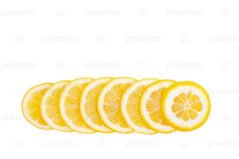 Круглые ломтики сочного спелого лимона лежат в ряд друг на друге. Вид сверху