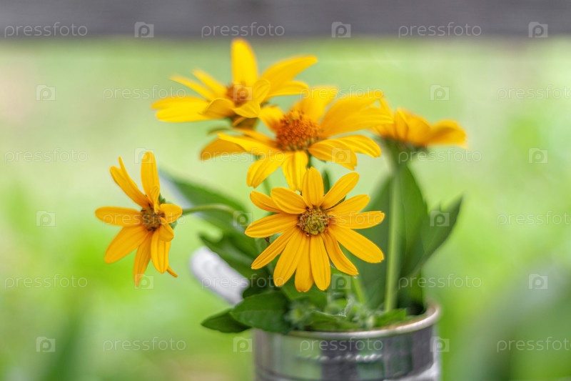 Букет желтых полевых цветов в старой консервной банке на размытом зеленом фоне с выборочным фокусом крупным планом
