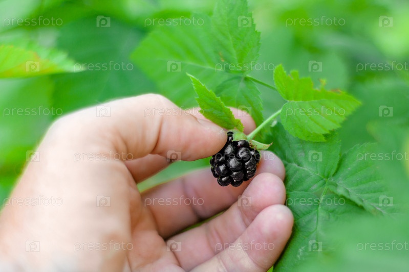 Рука человека срывает куст спелой ежевики в саду. Крупным планом, размытый фон. Селективный фокус