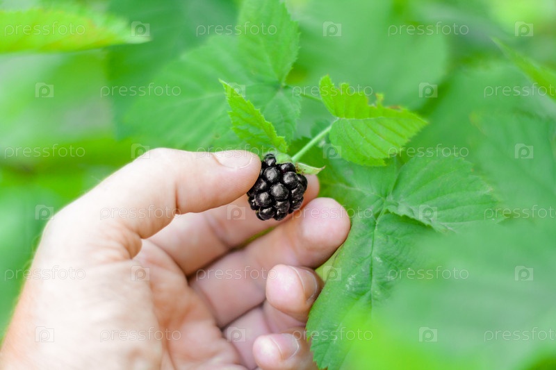Мужская рука собирает в саду спелую ежевику. Крупным планом, размытый фон. Селективный фокус