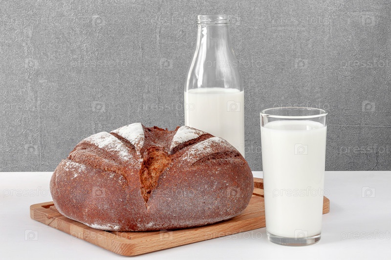 Бутылка, стакан молока и круглый ржаной хлеб на разделочной доске на белом фоне