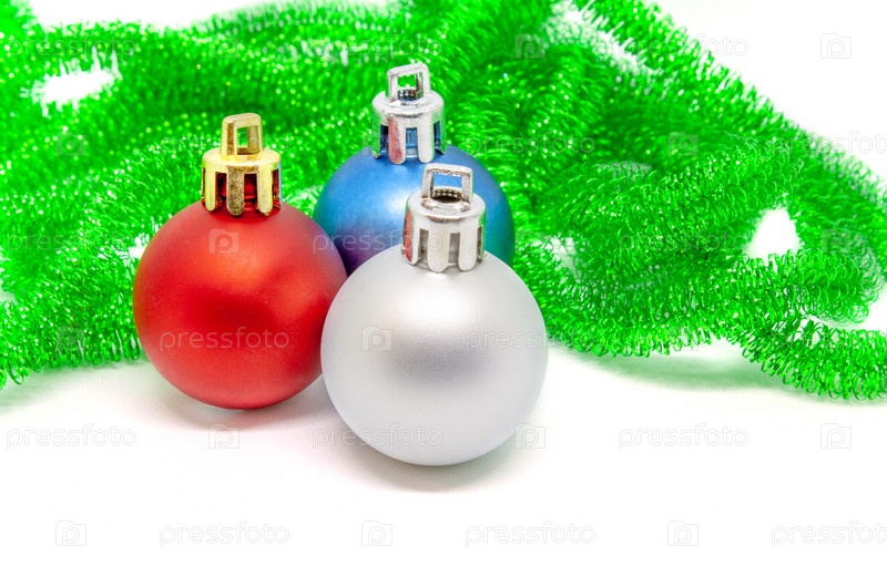 Разноцветные елочные шары на фоне рождественской мишуры на белом фоне крупным планом
