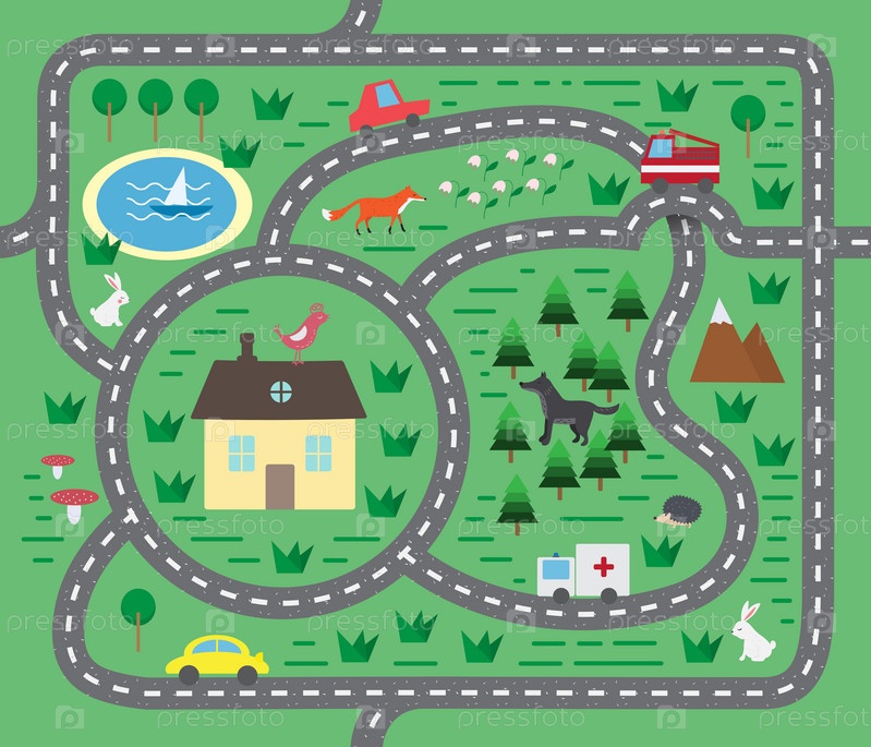 Детский коврик с животными и игрушечными машинками