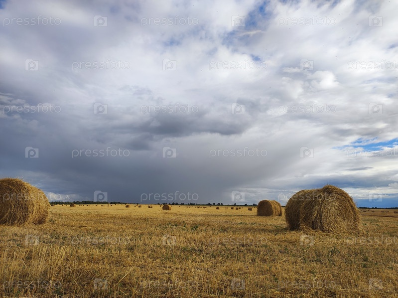 Стоги сена или соломы перед дождем. Сено в рулонах
