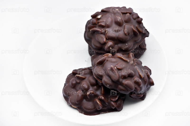 Шоколадное печенье с орехами. Сладкая закуска на белой тарелке