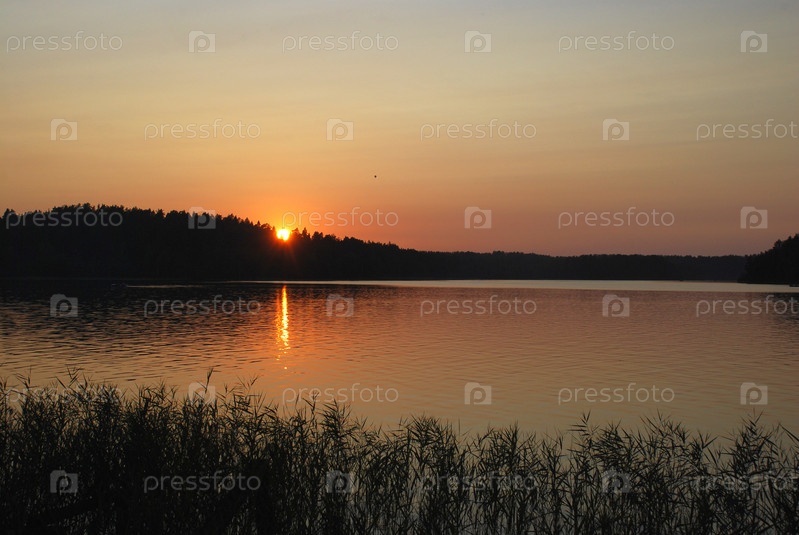 Закат на берегу лесного озера. Лесное озеро, на берегу растут деревья и кусты, сквозь пространство между ними видно садящееся за горизонт солнце