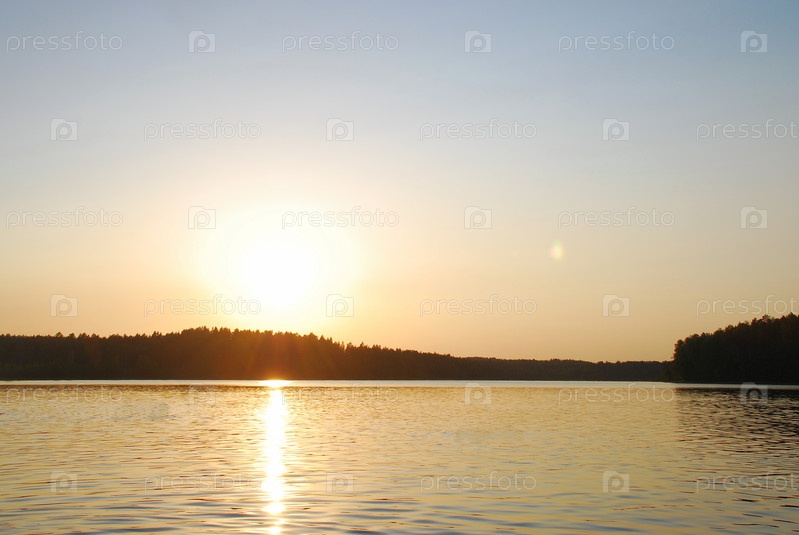 Закат на берегу лесного озера. Солнце низко опустилось над лесом, растущим на берегу озера. Поверхность воды почти гладкая, от нее отражаются солнечные лучи