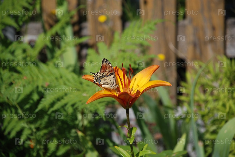 Красивая бабочка сидит на большом цветке