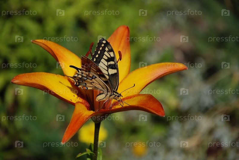 Красивая бабочка махаон сидит на большом цветке