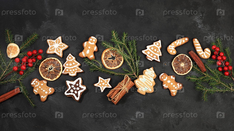 Рождественская новогодняя еда, традиционные праздничные пряники с еловыми ветками, сосновыми шишками и украшениями, идея дизайна блюда и приготовления еды, фон 2024 года, концепция выпечки, выборочный фокус