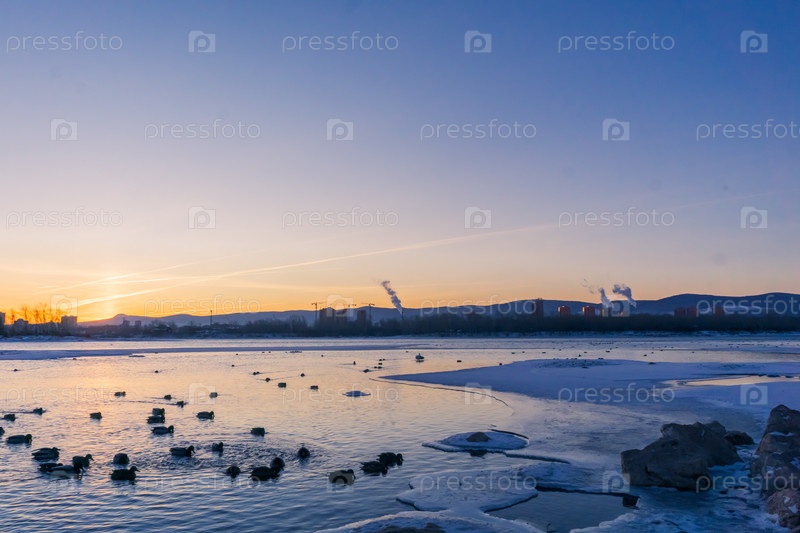 Зимний яркий рассвет над Енисеем в центре Красноярска