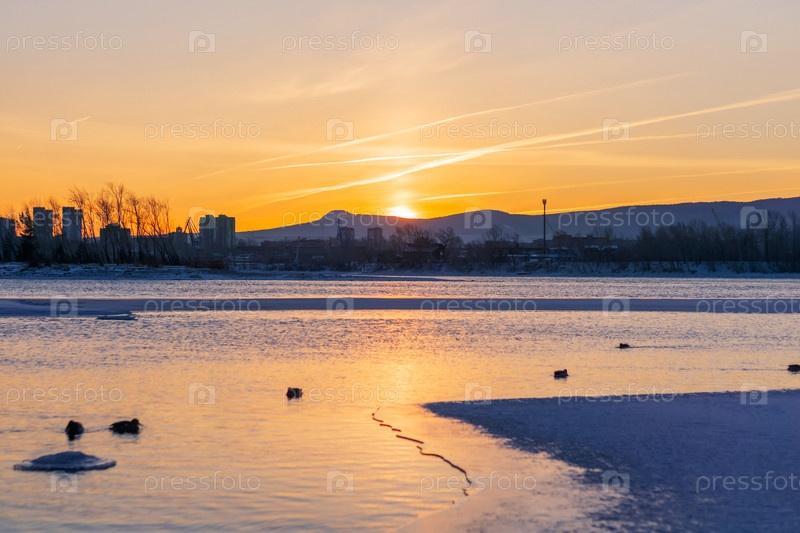 Зимний яркий рассвет над Енисеем в центре Красноярска