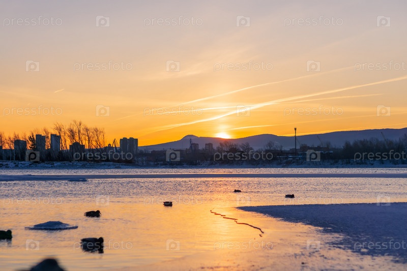 Зимний яркий рассвет над Енисеем в центре Красноярска