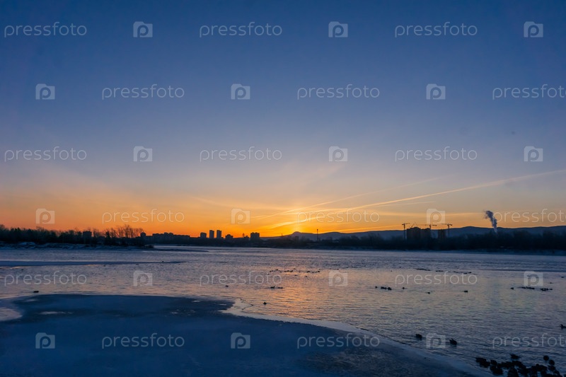 Зимний яркий рассвет над Енисеем в центре Красноярска