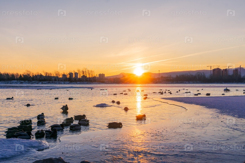 Зимний яркий рассвет над Енисеем в центре Красноярска