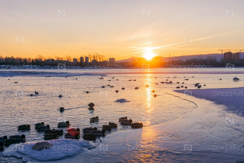 Зимний яркий рассвет над Енисеем в центре Красноярска