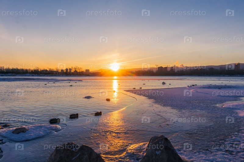 Зимний яркий рассвет над Енисеем в центре Красноярска