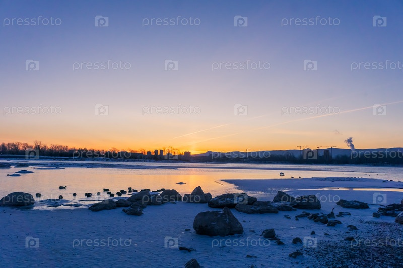 Зимний яркий рассвет над Енисеем в центре Красноярска