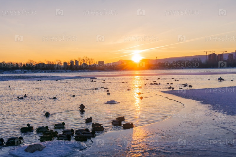 Зимний яркий рассвет над Енисеем в центре Красноярска