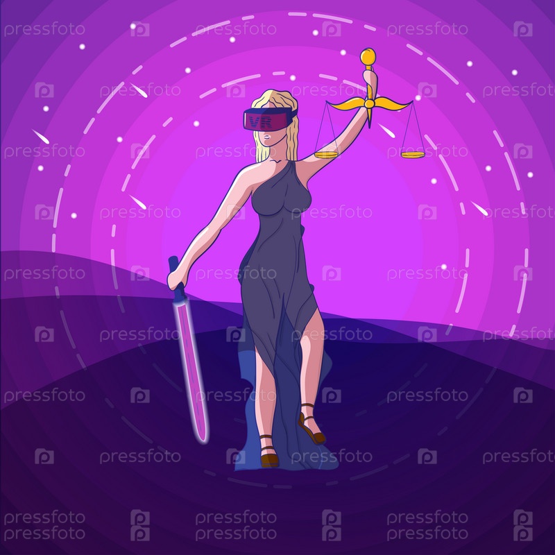Правосудие Фемиды с весами, очками виртуальной реальности VR