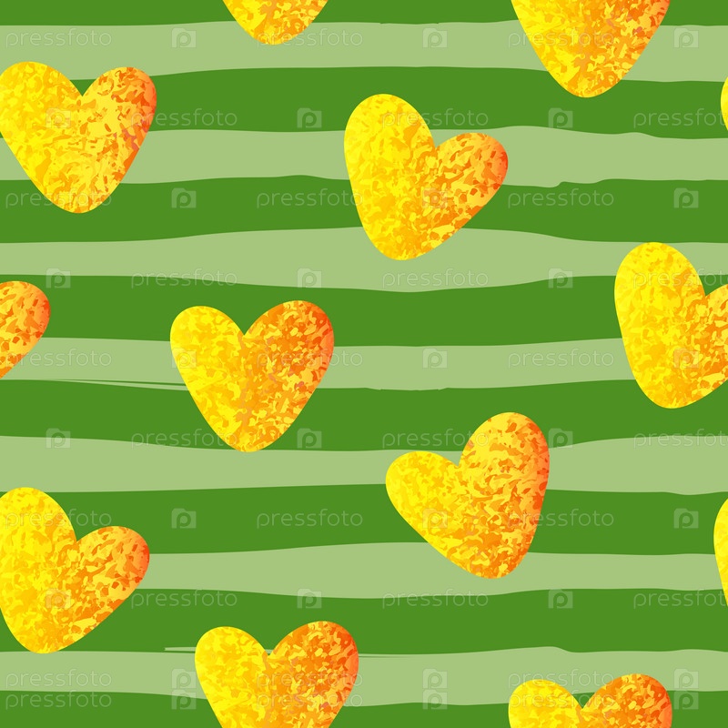 Сверкающее золотое сердце бесшовный узор на полосатом зеленом фоне